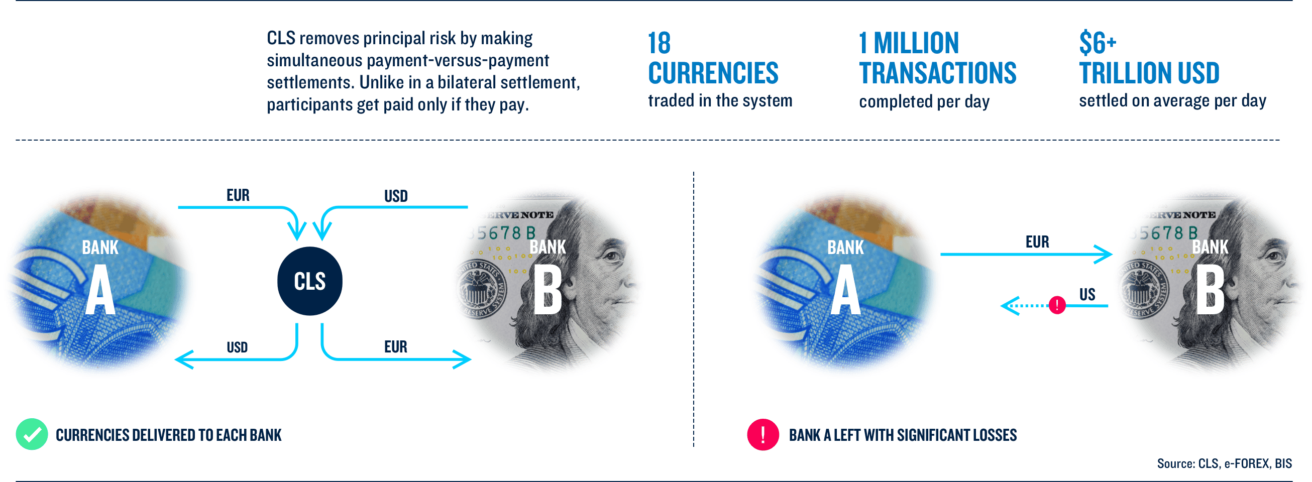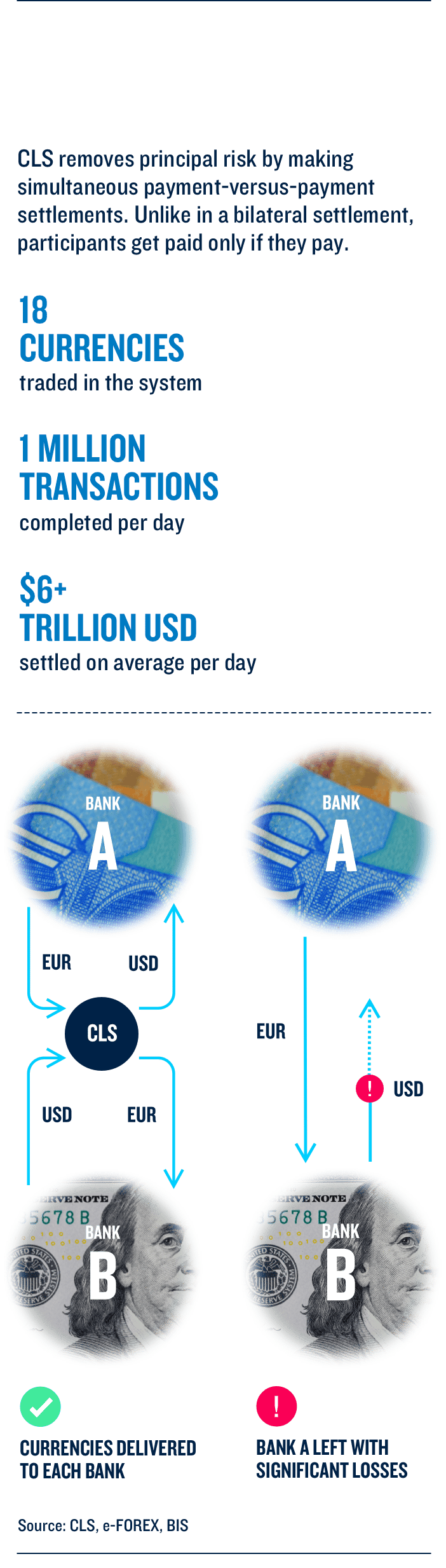 A digital payment instruction flows through the virtual ether—one of the 1 million payments that will be processed that day by Continuous Linked Settlement (or CLS), the world’s leading foreign-exchange settlement bank. It’s moving quickly, transitioning $750 million from New York to an equally sizable euro payout in Frankfurt.