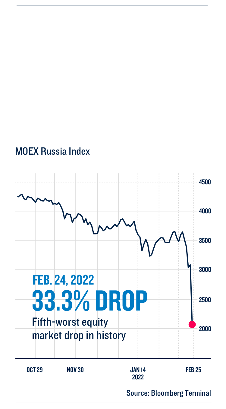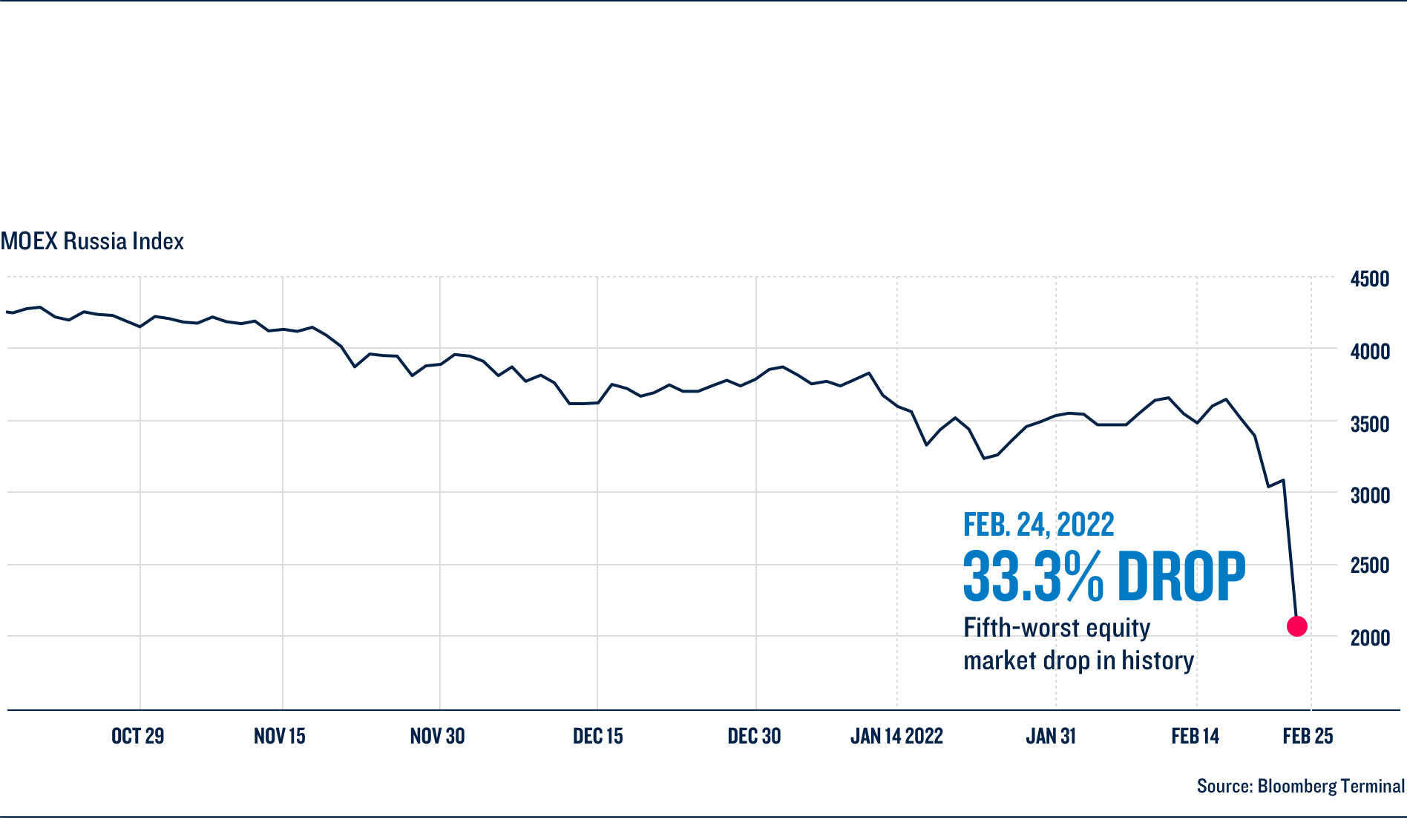 Behavior in the Russian stock market suggests investors did not believe that military conflict was coming. Stocks plummeted on the day of the attack on Ukraine.