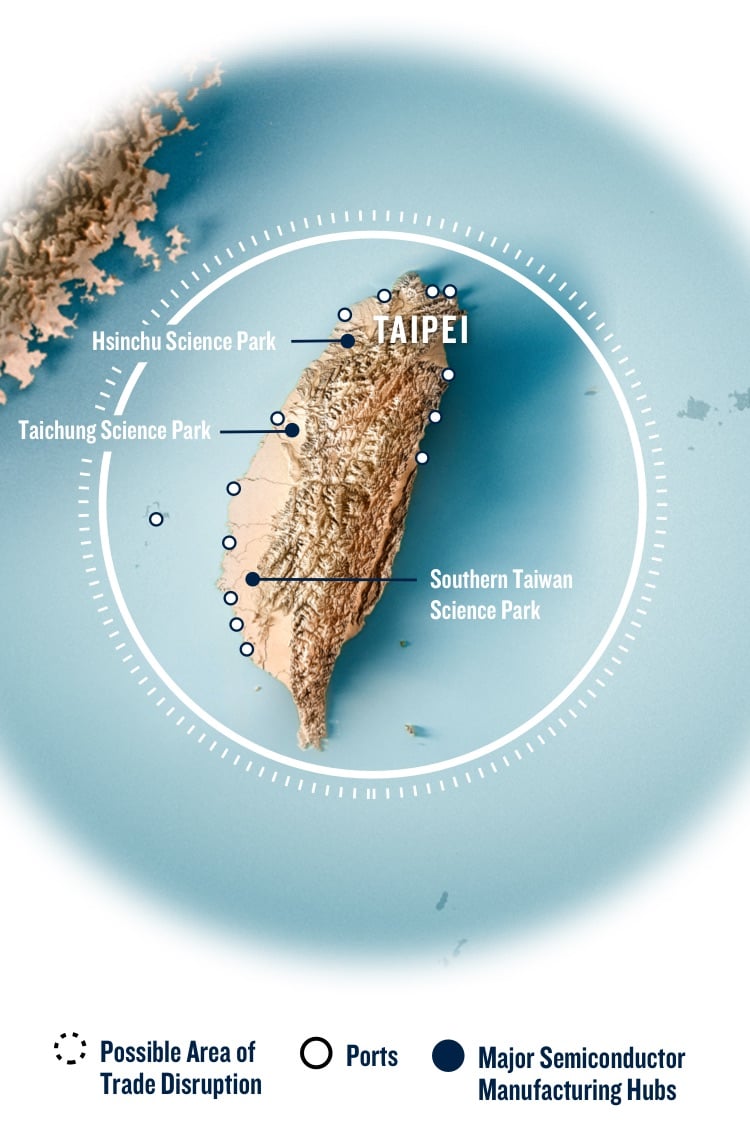 Taiwan is the world’s leading producer of semiconductors, often called the “new oil.” If conflict arose and led to an interruption in trade from Taiwan’s ports, it would cripple the manufacturing of everything from cars to computers to combat drones.